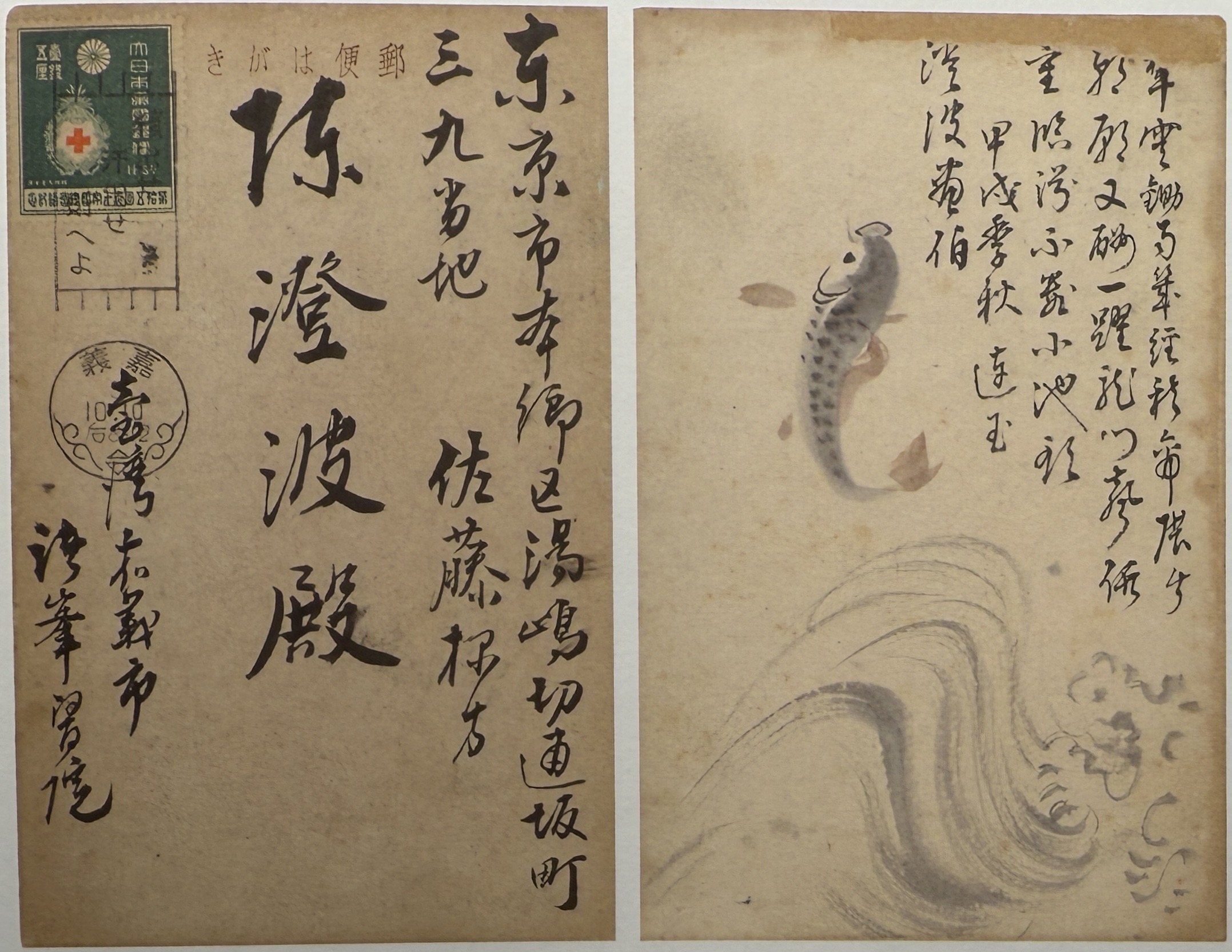 彼時入選後,來自嘉義的祝賀信如雪片般飛往東京。其中一張由張李德和寄出的賀詩明信片極具代表性。【圖6】詩中寫道:「犁雲鋤雨幾經秋,帝展今朝願又酬,一躍龍門聲價重,臨淵不數小池頭。甲戌秋季,連玉。」詩後還畫上一條自水花中奮力躍起的鯉魚圖像,寓意著歷經努力後終成正果,祝賀陳氏「躍過龍門」。