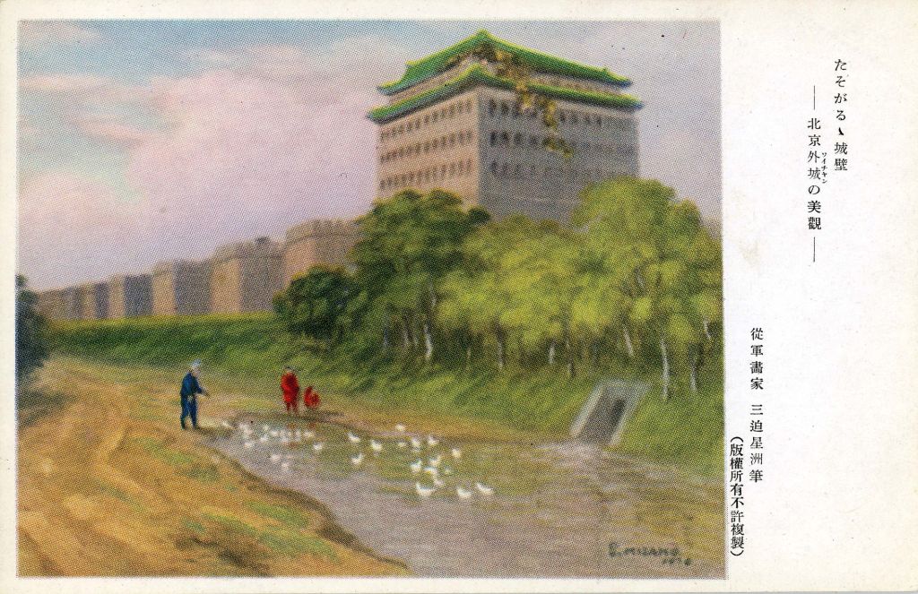 剛好,彭國躍的研究指出,1930年代出現大量有三迫星洲落款的東亞風景繪葉書,部分甚至標記了「從軍畫家」身份。【圖5】並且,根據《日本美術年鑑》記載,這時的三迫星洲加入了1938年成立的「大日本陸軍從軍畫家協會」,此團體以西洋畫家藤島武二(1867-1943)為副會長,成員包含藤田嗣治(1886-1968)、向井潤吉(1901-1995)、中村研一(1895-1967)、小早川秋聲(1885-1974)、古城江觀(1891-1988)等「從軍畫家」。[8]