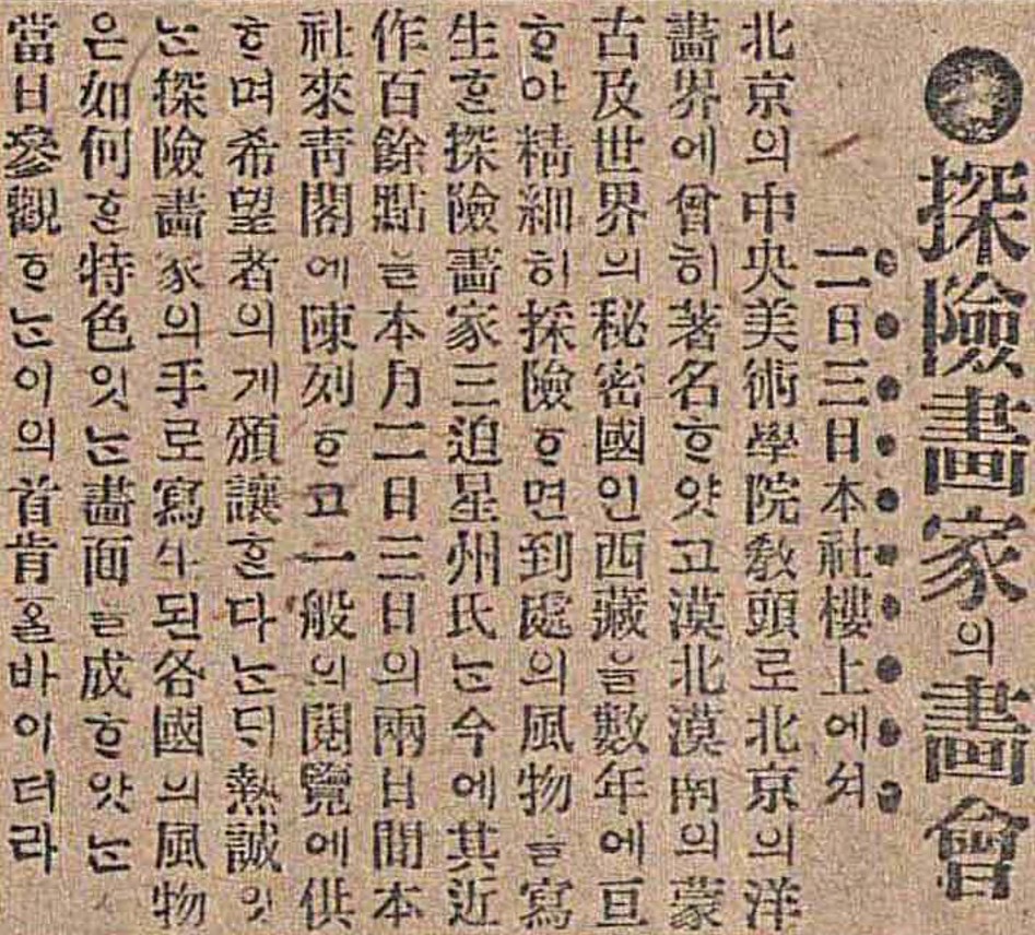 [4] 原文:「北京의中央美術學院教頭로北京의洋畫界에曾히著名흐얒고漠北漠南의蒙古及世界의秘密國인西藏을數年에亘흥아精細히探險흐멘到處의風物을寫生흔探險畫家三迫星洲氏는今에其近作百餘點을本月二日三日의兩日間本社來青閣에陳列흐고一般의閱覽에供흐메希望者의게頒讓흔다는듸熱誠잇는探險畫家의手로寫生된各國의風物은如何흔特色잇는畫面을成흐앗는當日參觀흐는잉의首肯을바읻더라。」詳見〈探險畫家의畫會〉,《每日申報》,1916年12月01日,第5版。全文以ChatOn.AI進行翻譯。