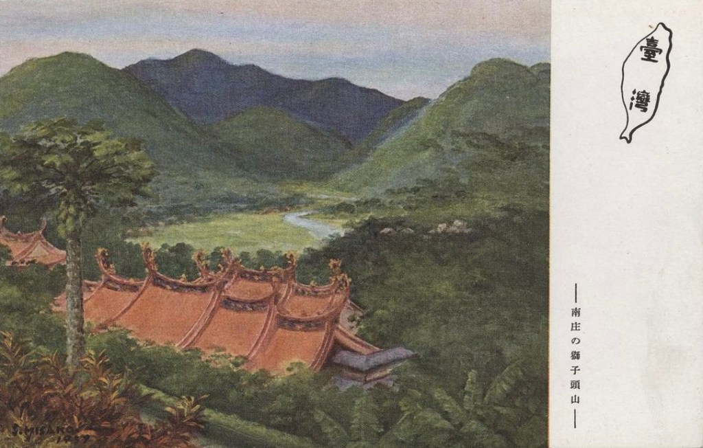 首先是描繪位於苗栗縣南庄鄉獅頭山的《南庄的獅子頭山》繪葉書。【圖7】該處清領時期就坐落著許多寺院,吸引信徒參訪。三迫星洲畫中的廟宇,屬於1900年代成立的獅頭山勸化堂,至於廟宇對面的蜿蜒溪流,則是苗栗的中港溪。
