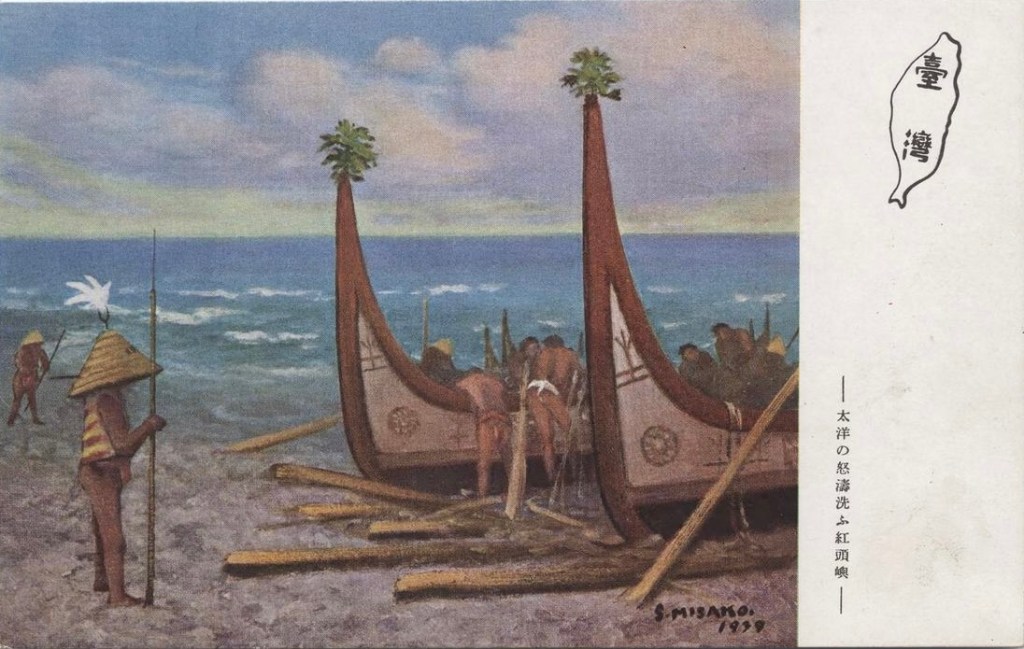 另一張是描繪蘭嶼拼板舟的繪葉書,三迫星洲將插在船首的雞尾羽裝飾,畫成綠色植物葉,這樣明顯的錯誤,推測是他或許沒有親自到蘭嶼,只能參考黑白照片作畫的結果。【圖8】