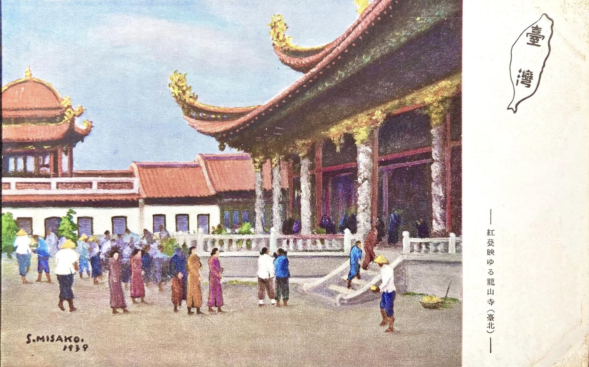 三迫星洲,《臺北龍山寺》(紅甍映ゆる龍山寺(臺北)繪葉書,1939,印刷品,9 x 14 cm,國立臺灣歷史博物館藏。圖版來源:葉柏強提供。