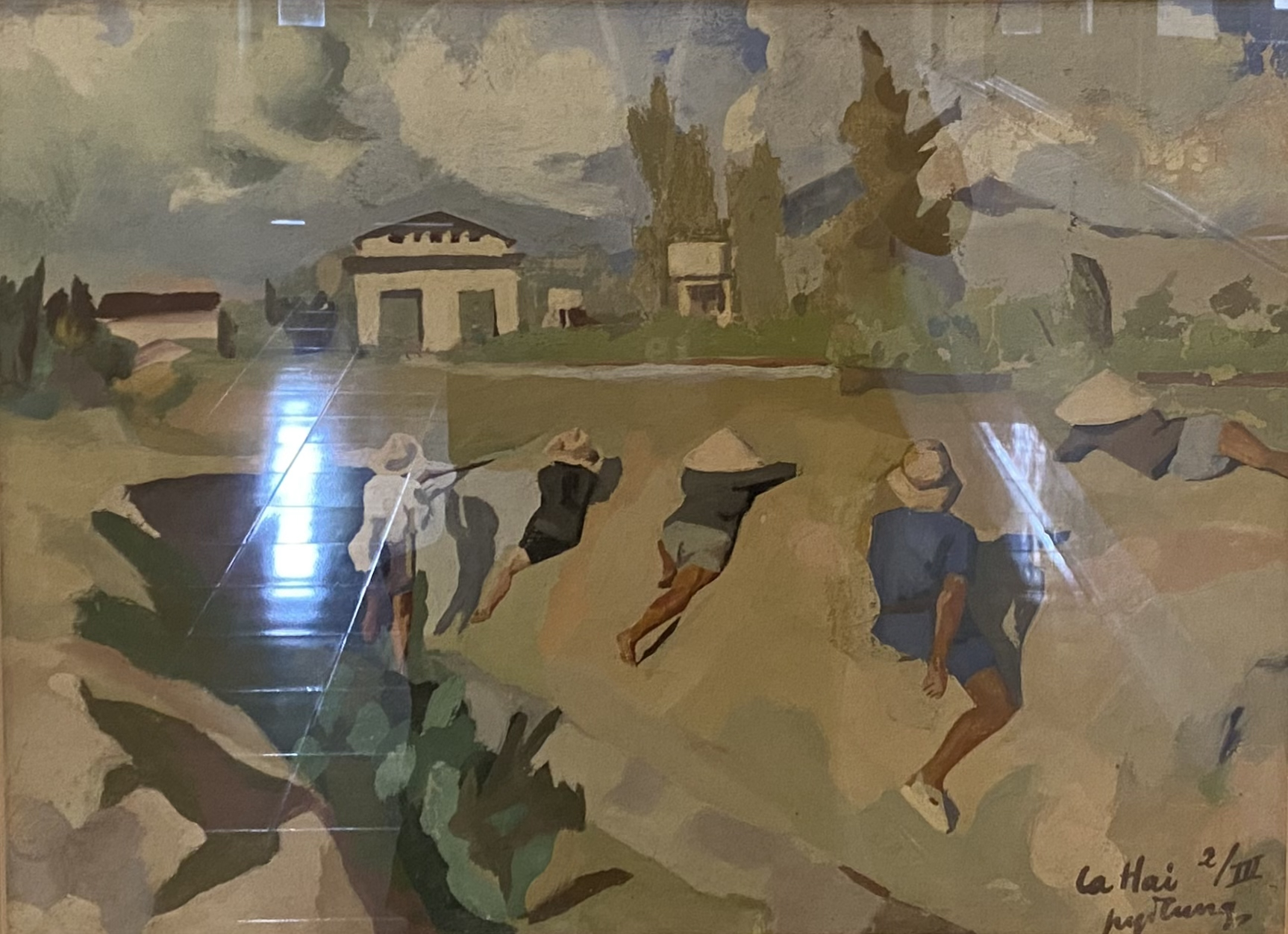在北越,「以黨領藝」的文化政策使藝術成為政治宣傳的工具,使藝術家成為文化戰線的一員,肩負意識形態宣傳與革命動員的任務,必須遵守官方主導的風格,讓藝術家多以工農兵為創作主體,作品須彰顯革命精神、集體奮鬥與民族團結等「正面」價值。導致許多藝術家親赴前線,與士兵共同生活,透過寫生與速寫記錄現場實況,以畫筆強調革命的正當性與人民團結抗敵的精神。這樣的創作模式使北越藝術日漸朝向社會寫實發展,無論是雕塑、繪畫、文學、戲劇或電影,皆遵循相似原則。曾任越南美術館館長的阮杜宮,其代表作《羅海游擊隊》(Du kích La Hai, 1947)【圖1】描繪抗法戰爭初期,富安省綏和地區的游擊隊在溝渠邊進行射擊訓練。畫面結合寫實筆觸與印象派之光影技巧,運用鮮明紅藍色調的明暗對比,營造出烈日當空的午後氛圍,彰顯軍民一體、堅毅抗敵的精神風貌,展現出「全民皆兵」的抗戰戰略。[6]