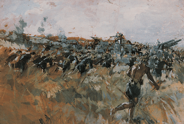 同樣擅長軍事主題的畫家的阮光壽與阮薟,其作品亦將戰爭視為一場跨世代的苦難。他們創作如《1975年的春天陽光》(Nắng xuân 1975, 1975)【圖2】與《尋于之戰》(Trận Tầm Vu)【圖3】等作,透過具動態張力與戲劇性的畫面重現歷史關鍵時刻。前者描繪西貢解放的歡騰時刻,畫面充滿閃耀的光彩,象徵南北統一與民族團結,在歡慶之中蘊含軍民歷經戰火的悲喜情緒,亦肯定了「人民戰爭」的正義力量;後者則聚焦抗法時期,農民僅以簡陋的武器對抗現代化裝甲與重砲的情境,以強烈對比表現南方人民反抗殖民的意志與苦難,突顯不對稱衝突下的悲劇性。[7]