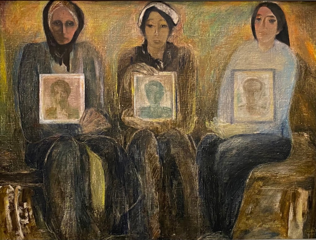 藝術家透過重構場景、召喚情緒與編織象徵,使觀者得以重新凝視曾經的現實,進而激發共感與反思。例如曾獲越南國家文藝獎的藝術家鄧德生,其作品《每個村莊》(Ở mỗi xóm, 1984)【圖4】描繪了三名農村婦女的肖像,象徵三個不同世代。她們皆曾歷經戰爭的洗禮,承受無數犧牲與悲傷。[8]在畫面中,三位寡婦靜坐於一片靜謐氛圍之中,僅有中間婦女的頭上繫著白色孝布,顯示她正處於哀悼之中。她神情哀傷且嚴肅,瘦弱的身體向前傾斜,彷彿在無聲中訴說內心的沉重。畫面的筆觸由細緻轉為粗重,搭配暗色調的運用,使整體氛圍更顯凝重。女性形象的層次推進與情感深度,不僅傳達對逝者的哀悼,更展現出女性在暴力陰影下堅毅生存的經驗。此類作品展現了藝術在戰後社會中,如何成為情感修補與意義重構的場域。不僅承載集體的感知經驗,也成為後世理解自身認同與文化位置的重要媒介。