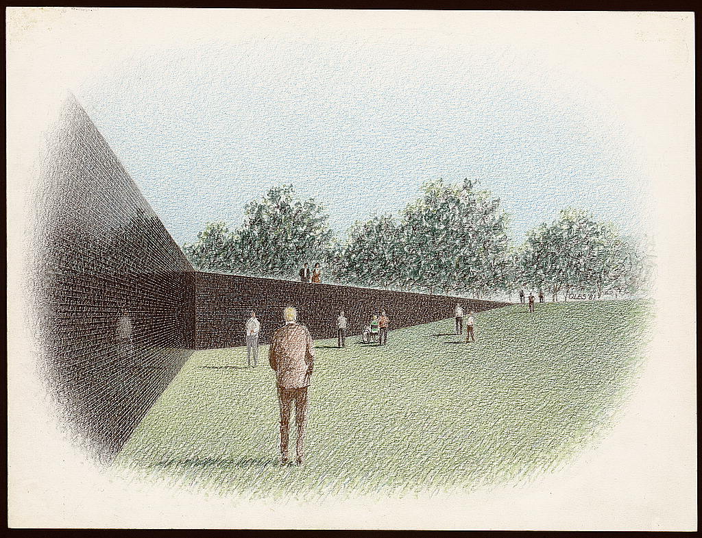 「我有一股強烈的衝動,想要切開這一塊土地。」1981年春天,當時還是耶魯大學建築系三年級學生的林瓔(1959-),在參觀了設計課基地後,倏地萌生了這樣的想法。「想像拿著一把刀子切開土地,簡單粗暴地,隨著時間過去,青草會長回來,但是刀子的切面卻永遠遺留下來,黑色、光滑而平坦的表面。這是一道大地的裂痕,也是一道永不癒合的傷疤,上頭刻滿了所有因戰爭而犧牲的人們的名字……」[1]