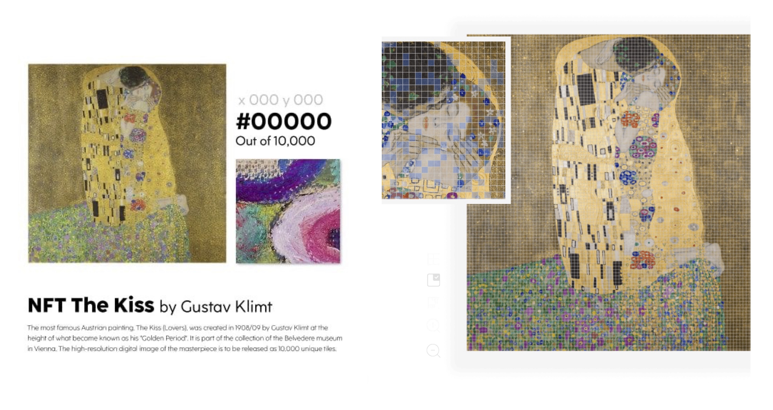 例如其中一個我很喜歡的案例是維也納的美景宮,將古斯塔夫・克林姆(Gustav Klimt, 1862-1918)的《吻》(Der Kuss, 1907-08),切分為一萬片小方格NFT【圖2】,並在情人節時像紀念品一樣開始販售,能夠送給朋友或愛人。當時因為教授牽線,因緣際會下與館方行銷總監接觸,因此可以和他們談談怎麼看待這件事情。雖然大部分人可能認為藝術不應該是炒作或買賣,但不可否認的是新科技的出現確實改變了我們與作品還有博物館互動的方式,或許可用更開放的眼光看待,這也是當時研究的初衷。