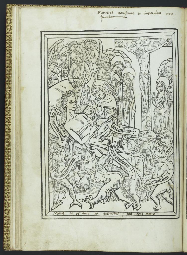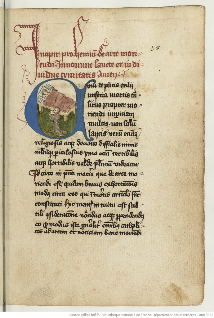 《死亡的藝術》(Ars bene moriendi)出自《師法基督》(De Imitatione Christi, L. I.),15世紀,墨水、紙與羊皮紙,法國國家圖書館藏。圖版來源:法國國家圖書館。