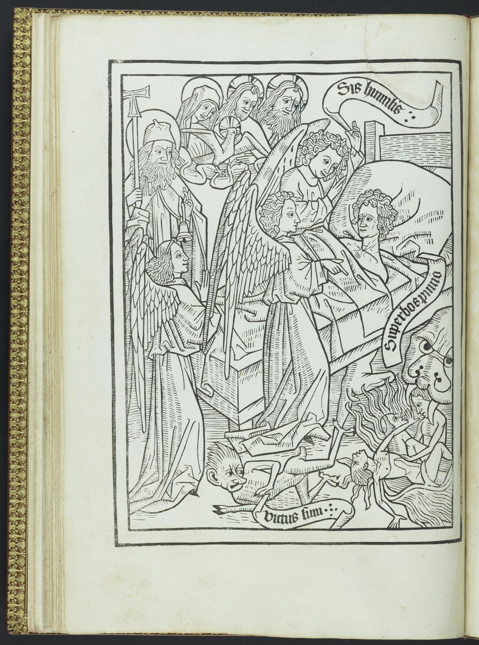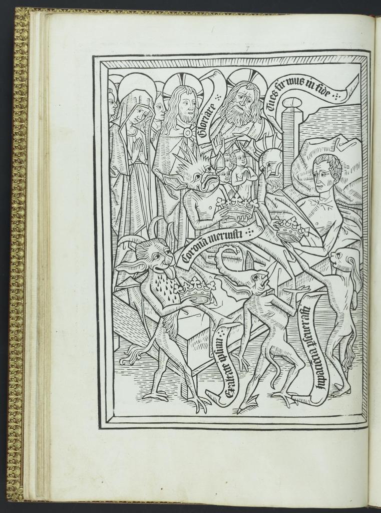 最後一幅插圖描繪莫里安死亡的時刻,經歷不同內心糾結的莫里安,透過祈禱與天使的幫忙後,獲得了內心的平靜並且得以進入天堂。在這幅圖像中【圖7】,一位教士將點燃的蠟燭放進莫里安的手裡,在死者上方,我們可以看到莫里安的靈魂(被繪製成一個小小裸身的人物)被天使接上天堂。