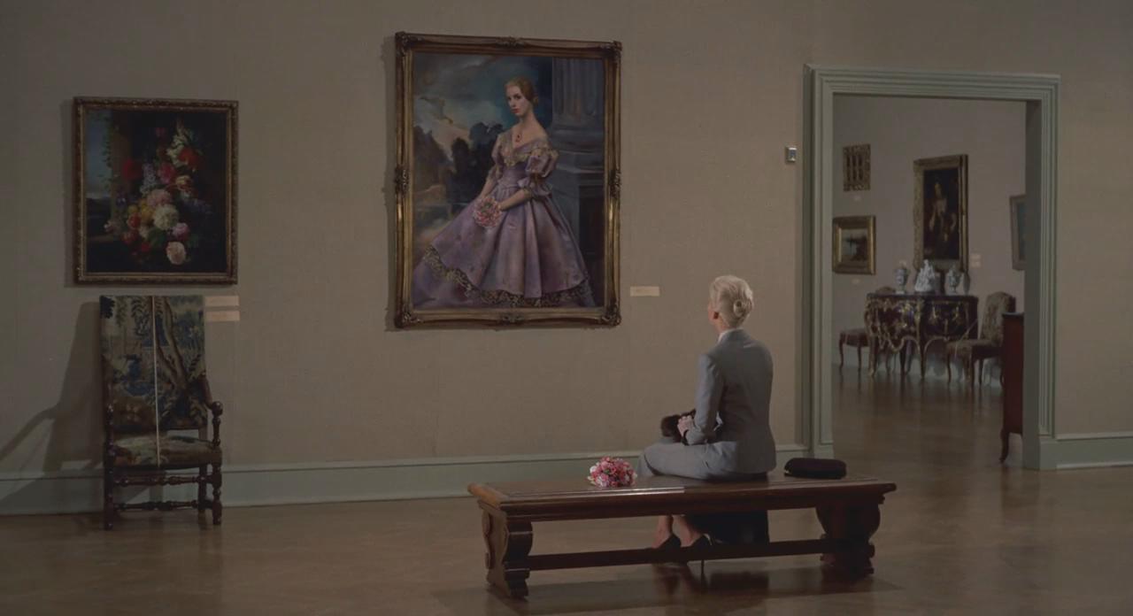 前者的取景地點位於舊金山美術館的榮勳宮(Palace of the Legion of Honor)6號展廳,畫作並非館內的真實收藏,而是參照製作人Herbert Coleman手裡的一幅美國女演員Vera Miles的相片,幾近周折,才最終邀請到藝術家John Ferren為電影量身創作了這幅油畫。[1] 希區考克兩度拍攝男主角斯科特跟隨瑪德琳來到這一美術館空間,凝視畫作的身影定格,更包涵了四重「觀看」:瑪德琳看畫中女子、斯科特望著瑪德琳、畫中女子注視瑪德琳(導演切換POV特寫鏡頭時亦使其直視包括角色、觀眾在內的所有人),作為觀眾的我們同時目睹著銀幕中的這一切。這幅油畫的展示,形成一個神秘、未知的入口(在後續劇情裡,也成為男主角的夢魘碎片),吸引觀看者進行揣測與想像。這亦可被視作希區考克慣用的麥高芬(MacGuffin)之一種。